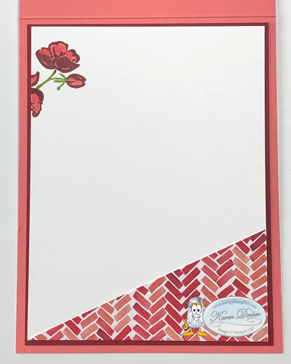 - Layer 3-Inside: DSP, 1 3/4 X 3 7/8 cut diagonally, Hint: if you make two cards, this is the remainder of two 3 7/8 X 5 1/8 pieces; Tip: Make sure when you cut your diagonal it runs the same way as the diagonal on the front. Yep – made that mistake.