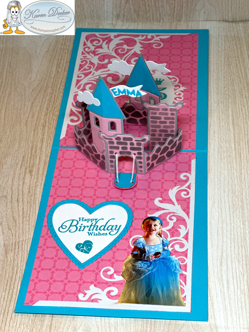 My granddaughter turned 5 in September and she loves all things Cinderella, so I purchased a pop up castle from the Karen Burniston collection of dies and several Disney stamp sets. I also shrunk down a picture of my granddaughter in the Cinderella gown her mother bought her for a Christmas gift last year. I had to shrink it several times to get the right sizing but wound up using all of the little pictures. She loved the card!